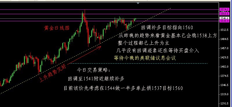 个人看法,如果今晚也就是周四凌晨12.30分和02.15分别维持低利率不变,或者变相的QE3,都会让美元继续承压,支撑黄金走高,逼向1560或创新高也有可能。