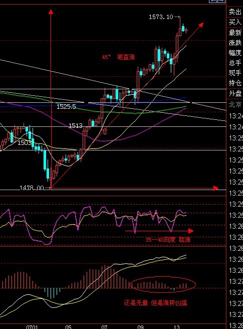 4小时短周期显示 1478涨势 属于极致的45度 笔挺上涨 而且自1525 开始到现在 已经属于无量的涨势 这个我们首先需要确认 而不能回避 那么结合日线均线和价格之间的关系 我们不难看出 黄金想要冲刺1596--1600 必将先要展开以此整理 即价格短线要跌回到1545附近甚至更低1538 完成一个整理 最后的在上冲高点 为何不能深跌?因为日线没有这个提示信息在里面