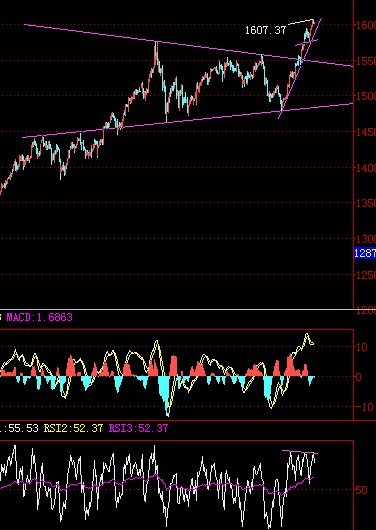 技术面:昨日金价再次大涨,金价依然处于上升通道内,上方已无压力。但上涨动量放缓。且指标早已背离,而下方三角形态也已完成。不排除突发性消系,急速调整。(如图240分)