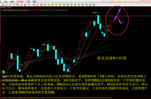 从4小时图来看;黄金分割线的的阻力位在3745附近,前面K线收取了3根大阳柱,但是依然无法突破上方的阻力位,那么不突破肯定就是要回落,165均线走平,布林带BOLL沿着K线形成一个环绕的圈形走势,分别突破布林带的下中上轨道线,MACD运行在高位绿色能量柱走平,KDJ也是即将死叉运行,拐头向下运行,整体趋势看多,但是我今天要给出一个做空的建议,计划布局在3500空单进场,止损带20个点,止盈看3450突破继续持有看3380.