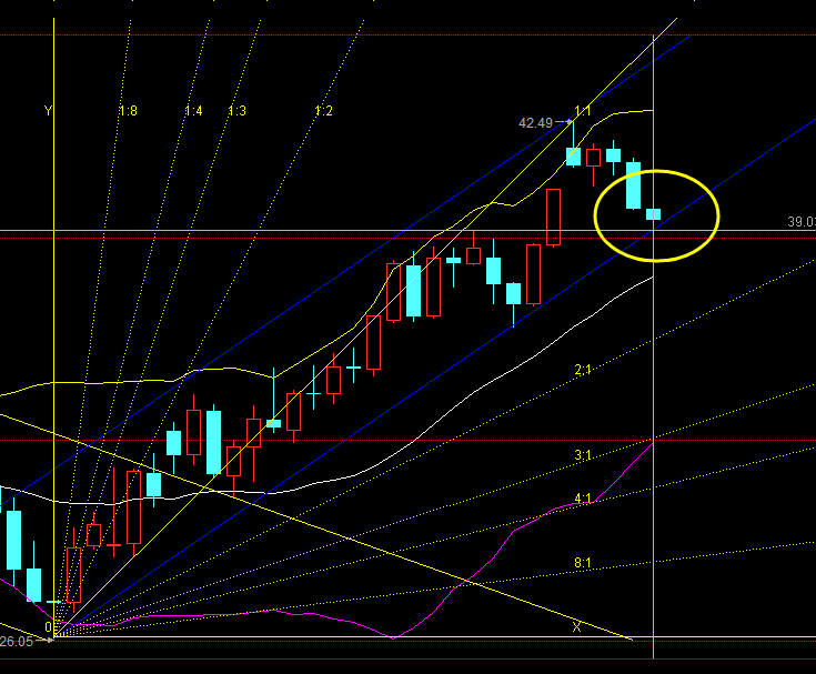 今日行情短期内会有一波回调,行情现在处于39.49附近,这个时候行情一路上涨,短期必定会有一波回调,本人预计收线在39美元附近。所以行情回调到39美元附近是我们出局的好时机。