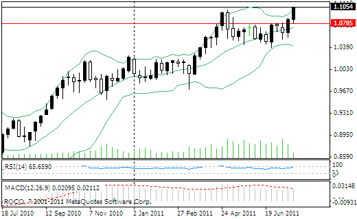 周日晚上奥巴马表示,两党已经就减赤和债务上限调整方案达成初步一致。会分为两步走提高2.4万亿美元的债务上限,不过会在今年之内完成;未来十年之内减持额度也会少于之前的3万亿美元,不包括增加税务等项。这一方案最早会在美国时间周一进行投票,如果其通过,可能使得美元债务上限顺利上调,美债避免违约发生。如果出现这种局面则美指可能大幅反弹,避险情绪会得到很大缓解,处于高位的澳元恐怕会大幅下跌。