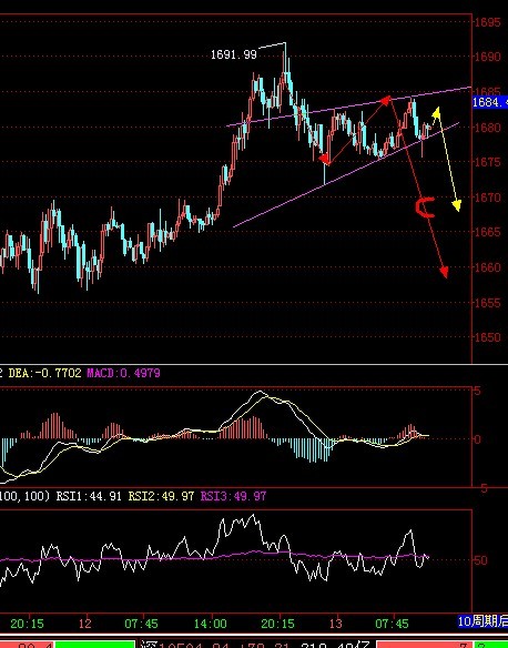 参考*作建议:今日关注1692新高附近压力,接近1692轻仓做空,目标1682-1675,突破1692大胆追多,目标1700-1710,目前如形成楔形最少会跌至1668以下,只要今日不冲破1692压力,以做空为主,不排除大跌可能。