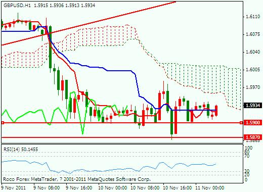 英镑兑美元上一交易日收出一根十字线,显示多空双方争夺比较激烈,而且双方力量趋于平衡,今日早盘交投清淡。1小时图中,昨日英镑兑美元仍然延续低位盘整态势,昨日盘中一度向下跌破1.5900,试探1.5870一线,但之后多方迅速发力向上进攻,目前汇率仍处于1.5900一线之后进行横盘整固,建议密切关注下方支撑区间1.5870-1.5900。