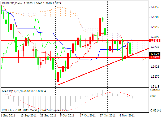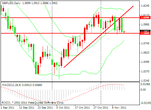 技术方面看,昨日欧元受基本面的影响大幅下挫,在近日1.3570位置获得支撑反弹,拉出了一根比较长的大阴线,但整体趋势仍然保持在上升趋势线内,MA CD出现了背离状态,早盘k线受到上升趋势线的支撑小幅上扬为一个十字线,可以看出今天多方和空方力量均衡,处于观望状态,上方阻力位置依然在1.3835,也请投资者密切关注今天18:00欧盟公布的欧元区第三季度GDP 初值。