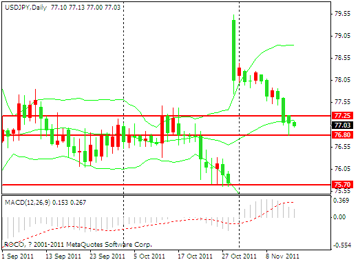 技术方面,日元在昨天拉出了一个比较 长得下阴线并在76.80获得支撑,并在77.25和76.80区间内形成了一个震荡的趋势,日本的震灾成本占GDP比值的百分之五最高能达到百分之七,加上大量的基础内部建设,导致日元的升值压力非常大,如果向下突破了76.80这一重要位置将下滑到近期的地点75.70附近,也请投资者密切关注。