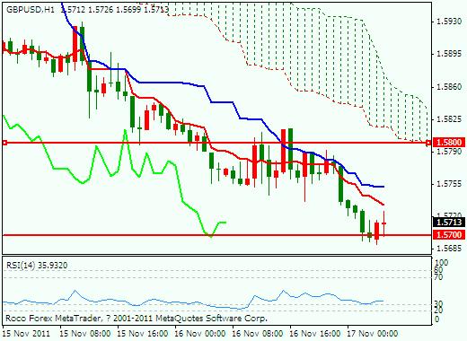 英镑兑美元昨日大幅下挫,今日早盘延续了此前的下跌走势。1小时图中,从云图中来看,英镑兑美元下行趋势明显,且汇率、基准线、下降云呈现空头排列,昨日在欧元大幅下跌的带动下英镑也出现下滑,同时英国央行公布最近一期季度通胀报告显示,英国央行在未来实施新一轮量化宽松政策的可能性加大,都打压英镑下行。目前汇率在1.5700之上有持稳迹象,但仍需进一步观察,如果汇率日内向下跌破1.5700一线,那么料将仍有一定的下跌空间。
