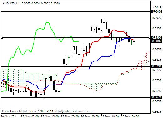澳元兑美元上一交易日大幅收阳,今日亚洲时段早盘小幅回落。1小时图中,昨日澳元兑美元由于受到欧洲消息影响而出现大幅跳涨,之后上涨势头强劲,轻松突破0.9900一线阻力,昨日盘中一度向上接近试探1.0000整数关口,但受到较强打压而回落,目前持稳于0.9900一线,若站稳此一线位置,料今日盘中仍有可能试探1.0000一线。