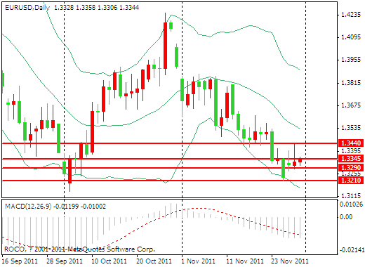 一度作为市场焦点的欧元集团会议在昨日似乎不会谈论任何实质性的内容,也没有放出任何令市场一振的消息,欧元之前“买预期”获得的涨势已经濒临回吐边缘。一次次地希望,一次次地失望。投资者的信心经不起如此的洗涤,欧元本身也是一样。历时长达两年之久的欧元区债务危机始终不见改善迹象。越来越多的机构开始表达出了对欧元的长期看空预期。国际评级机构惠誉29日宣布,将美国主权债信评级前景下调至负面,并要求美国在2013年年底前拿出“可靠计划”解决不断膨胀的预算赤字,否则可能下调美国现有的“3A”评级。荷兰财政部在一份声明中指出,预计该国2011年财政赤字将占国内生产总值的4.5%,较9月预期水平高出0.3个百分点,与此同时,据知情人士报导称,意大利和葡萄牙等部分陷入困境的欧洲国家正在施压本国银行购买政府债券。美国总统奥巴马、欧洲理事会主席范龙佩、欧盟委员会主席巴罗佐28日在白宫举行年度峰会,承诺将加强大西洋两岸的经贸合作,并携手重振经济、创造就业和确保金融稳定。奥巴马当日表示,美国随时准备帮助欧元区应对债务危机。