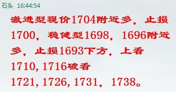 今日看法:现价1719附近多,止损个人适度控制,上看1726破看1730,1735,1738。1730不破空,激进型1726附近不破空,止损个人适度控制,下看1719,1714破看1704再破下方会向1698,1680,1674,1661附近靠近。1704,1702附近不破可继续多上,止损个人适度控制,上看1716。行情多变,具体恕不能一一在金评中详尽,盘中机会另给##。