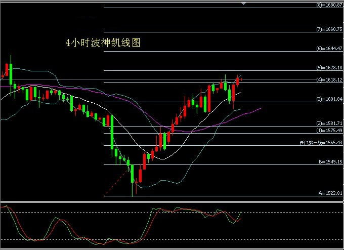 4小时波神凯线图,昨天从3线半上升到4线半,然后下跌到2线半,收于4线半,即是收于1622,短线回调后看涨,中线看涨,支持位1610-1595-1576,压力位1625-1635-1655.