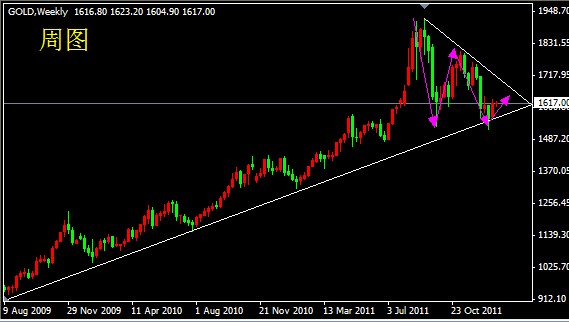 大家看下面的周图,大家可以看到当前的走势不仅是处于三角整理当中,而且处于波浪的第四浪上,如果这个浪是回调三浪这说明如果价格突破上缘白色线,那么黄金将重新回到上涨走势,不用说后势以低多为主,见低就可以买入,但是想要重回上涨走势还要看上方非常关键的点位:1628(斐波那契38.2%);1640;1660(斐波那契50%);1670;1680;