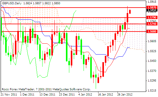 技术分析:英镑兑美元昨日同欧元走势相符出现了一波上涨的行情,多空双方在昨天的争夺一度比较焦作,让投资者举棋不定,在回踩云层基准线之后获得了有效的支撑并且反弹,但是最终收于了一根中阳线,并且整体的汇价站稳在了1.5790的一线位置之上,而且经突破了下降云层的包围,今天早盘同样延续着上涨的势头,整体的价格区间运行在了1.5870和1.5790两线之间,在近期14个交易日当中镑美上涨了600个基点,单边的上涨行情主要是受到利好消息频现的影响,建议大家顺势而为并且合理的控制好自己的仓位风险。