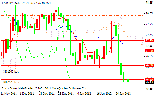 技术分析:美元兑日元昨日收于了一根十字线的形态,在盘中多空双方的争夺一度比较激烈,但是在收盘阶段又趋于了均衡,今天早盘继续下跌,目前形成了一根小阴线,整体的汇价已经站稳在了76.20一线位置的下方,日元的不断升值使日本的众多出口企业承受着较大压力,当日元升值到了76.00汇价下方的时候,日本的出口企业就会面临着亏损,所以在近期日被央行在汇率两次突破76.00后大举干预外汇市场走势,以此来降低损失,技术方面看日内下方的支撑为76.00和75.65两线位置,如果今天空方能够成功回踩75.65的支撑位,日本央行将会再次拉响干预汇市的警报,同时该位置也是二战后至今的最低点,请投资者关注日本央行的举措以及下方两线的支撑作用。