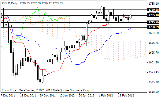 技术分析:黄金上周五时段多方试探1735阻力未果后小幅回落,收于一根小阴线但是并没有出现方向性的选择,维持了震荡的态势,今天亚洲盘多方继续试探着1735的阻力,截止到目前并未获得有效的突破,金价的运行空间为1735和1715两线之间,这两线位置在今天日内保有着阻力和支撑的作用,投资者可以根据这两线位置的作用及K线的变化进行短线的波段操作。
