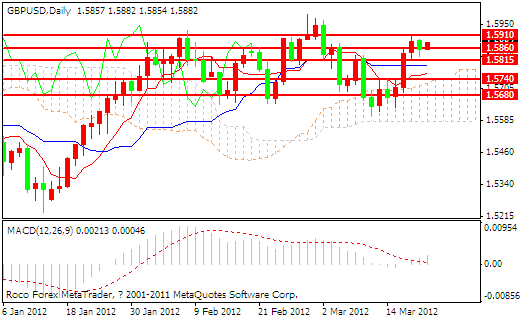 技术分析:镑美昨日收于一根小阴线,整体回吐了前一个交易所有的涨幅,形成了一个看跌吞没形态,今天早盘汇价在1.5860的支撑作用下小幅上涨,但是MACD指标呈现了明显的背离,显示出了多方疲软的态势,如果k线今天能够突破1.5860的支撑将会继续的下行,下方的强支撑为1.5815,如果1.5815不能承受空方的打压,英镑兑美元将会结束此前的上涨趋势。