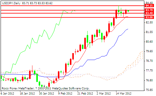 技术分析:美元兑日元昨日收于一根小阳线,整体上维持了高位盘整的态势,从CFTC的持仓报告来看,美元兑日元单边净多头头寸较多,获利回吐压力较大,所以近期美元兑日元回调的可能性不断增加,技术方面看k线在83.70和83.40内窄幅震荡,并没有明确的方向,这两线位置对日内的多空双方将构成阻力和支撑的作用。
