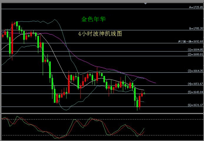 4小时波神凯线图,昨天从4线下跌到6线,然后上升到4线半,收于4线半,即是收于1644,短线反弹后看跌,中线趋势看跌,支持位1635-1630-1610,压力位1647-1655-1670.