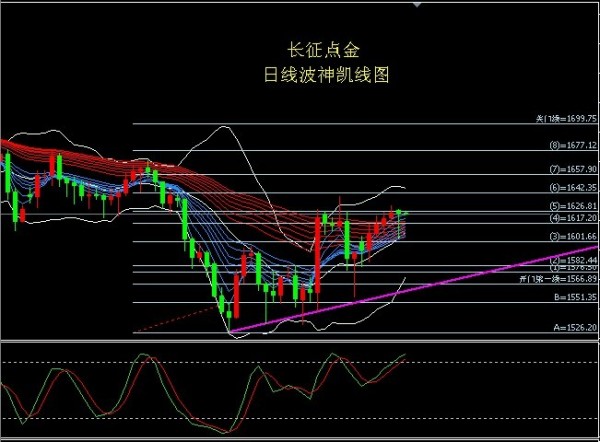 日线波神凯线图,昨天从5线下跌到3线半,然后上升到5线,收于5线,即是收于1627,短期看冲高回调,中期趋势看涨,支持位1613-1586-1572.