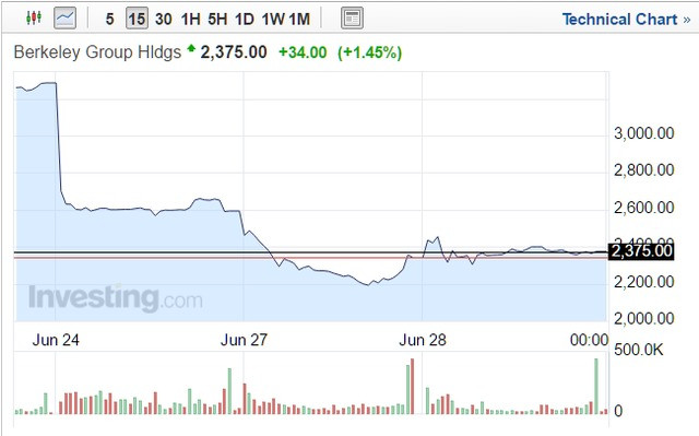 过去三年,因住房紧张、需求强烈、低息贷款及政府支持,不少房产商的股价都呈上升态势。英国公投退欧带来的不确定性导致买家对英国房价持观望态度,并推迟购房行动,再加上长期经济衰退,未来一年的房价将降低5[%]。英国房产商的股价大跌,跌幅为28[%]-37[%]。房地产市场更是转向暗淡。