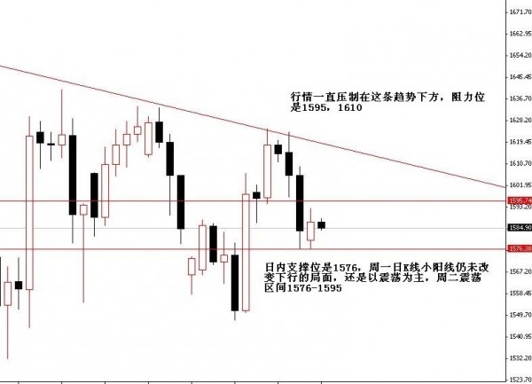 从现货黄金日K 线上看,4个月以来都是处于下跌趋势当中,金价至少须站上1625美元/盎司,才能扭转下跌趋势。周一的日K线的小阳线并不能有效改善疲弱偏空的技术面,金价区间震荡格局仍存,且短线总体趋势仍略趋下行。上方阻力1595,下方支撑1576;1550。