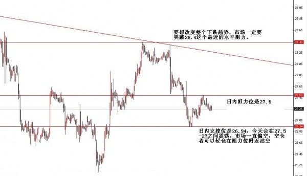 白银四个月以来,一直在是在下行趋势线当中,一直未能扭转上行的阻力位28.4重要的水平阻力位,突跛28.4就可以大胆做多,真正扭转四个月的下行趋势。昨天都是在27-27.5之间震荡,说明下方27有买盘支撑,但是市场仍偏空,周二交易上,仍逢高沽空为主,止损位是27.5,支撑位是26.94,日内阻力位是27.5,28.4.
