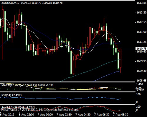 乐观情绪得以释放,慢涨慢跌得行情,日内国际黄金在1608-1612之间窄幅震荡,金价在布林带中轨上方运行,下方支撑位于5日均线所在1603附近,stoch低位金叉上行,技术形态偏为多头;小时图均线系统多头排列,RSI相对强弱指标平稳运行;整个市场多空频繁交织,策略上可尝试逢低做多!图片:黄金15分钟K线