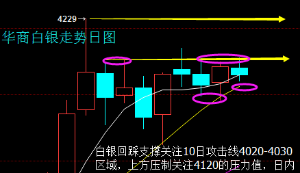 回顾昨日行情,白银昨日先跌后涨,日图银价以一根下影线略长的小阳K线收盘,短线下方受制于日线级别10日均线的支撑,周期内银价依旧保持高位区间整理,上升通道保持良好,整体趋势以震荡偏强形态发展中。日内亚盘,银价开盘价格试探4120的压力值未果后出现回落,日图压力位关注4100、4120,下方支撑值关注10日均线4020-4030区域,周期内银价趋势以10日攻击线看好震荡偏强走势,技术指标上,日线布林通道开口上扬,上轨趋势线上移至前期高点4230一带,下方支撑回升4020、4000的位置,微观盘面,当前均线系统保持多头排列,MACD当前多头动能减弱,随机指标及摆动指标呈现下滑趋势,指标偏空。综述,白银目前依旧处于高位横盘蓄势整理节奏,日内需留意回踩支撑的有效性,若下方10日均线的支撑值未能下破的话,那么短期价格可能会以此位置做起涨点继续冲高发展,操作上笔者建议首次回踩4020-4030区域可尝试多单。微信:gmx3496