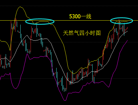 四小时图:布林带缩口运行,上轨向下拐头,K线运行于中上轨之间,技术指标macd轻度背离,拖累多头反弹的步伐,天然气价格反弹只有刷新昨日高点5285上破并站稳5300一线上方,才能打开通向前5380-5431一线的大门。