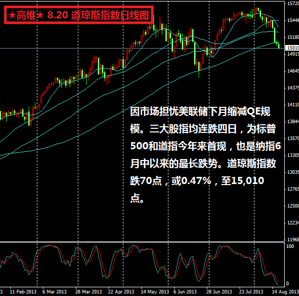 上周国债收益率从此前一周的2.580%升至2.827%,创6月以来最大每周升幅,因乐观的劳动力市场数据引发有关美联储将最早于9月开始削减购债规模的猜测。美国公债收益率不断上升,市引发场猜测美国联邦储备委员会(Fed)即将退出宽松货币政策,美国国债收益率受此影响继续走高。美国股市周一继续全线走低,延续了上周的跌势。黄金则因担忧因担忧美联储缩减刺激计划,盘中徐徐下跌。