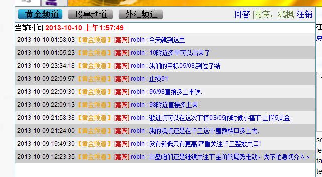 - 2013-10-10 09:22:54 【黄金频道】 [嘉宾] robin : 今日白盘的建议我们还是比较倾向于多单,激进点可以于千三整数关口到目前价位附近小多渣上,止损95/96