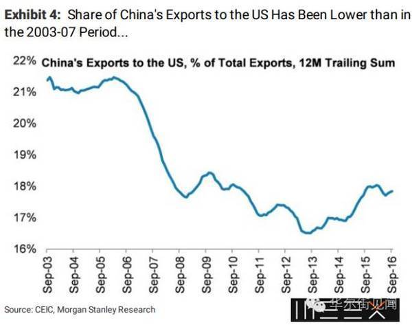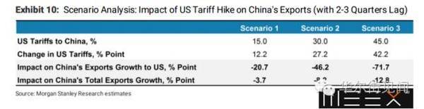 根据摩根士丹利的测算,即便提到45[%]的惩罚性关税,中国的总出口仅会下降13[%]。