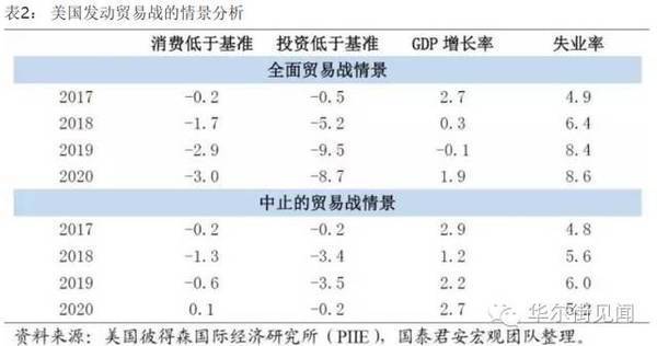 美国知名智库彼得森国际经济研究所对特朗普贸易战的可能后果进行了情景分析,结果显示:在全面贸易战情景下,美国对中国、墨西哥进口商品分别征收45[%]和35[%]的关税,中国和墨西哥也对美国进口商品征收同样的关税,美国将会出现进出口萎缩,国内物价上升,消费、投资连续多年低于无贸易战的基准情形,经济增速不断下滑并于2019年进入经济衰退,失业率从目前的4.9[%]到2020年攀升至8.6[%];在中止的贸易战情景下,即美国对中国和墨西哥高关税政策执行一年后中止,美国消费、投资也同样会连续数年低于基准情形,经济增速到2018年将降至1.2[%],失业率到2019年将升至6[%]。