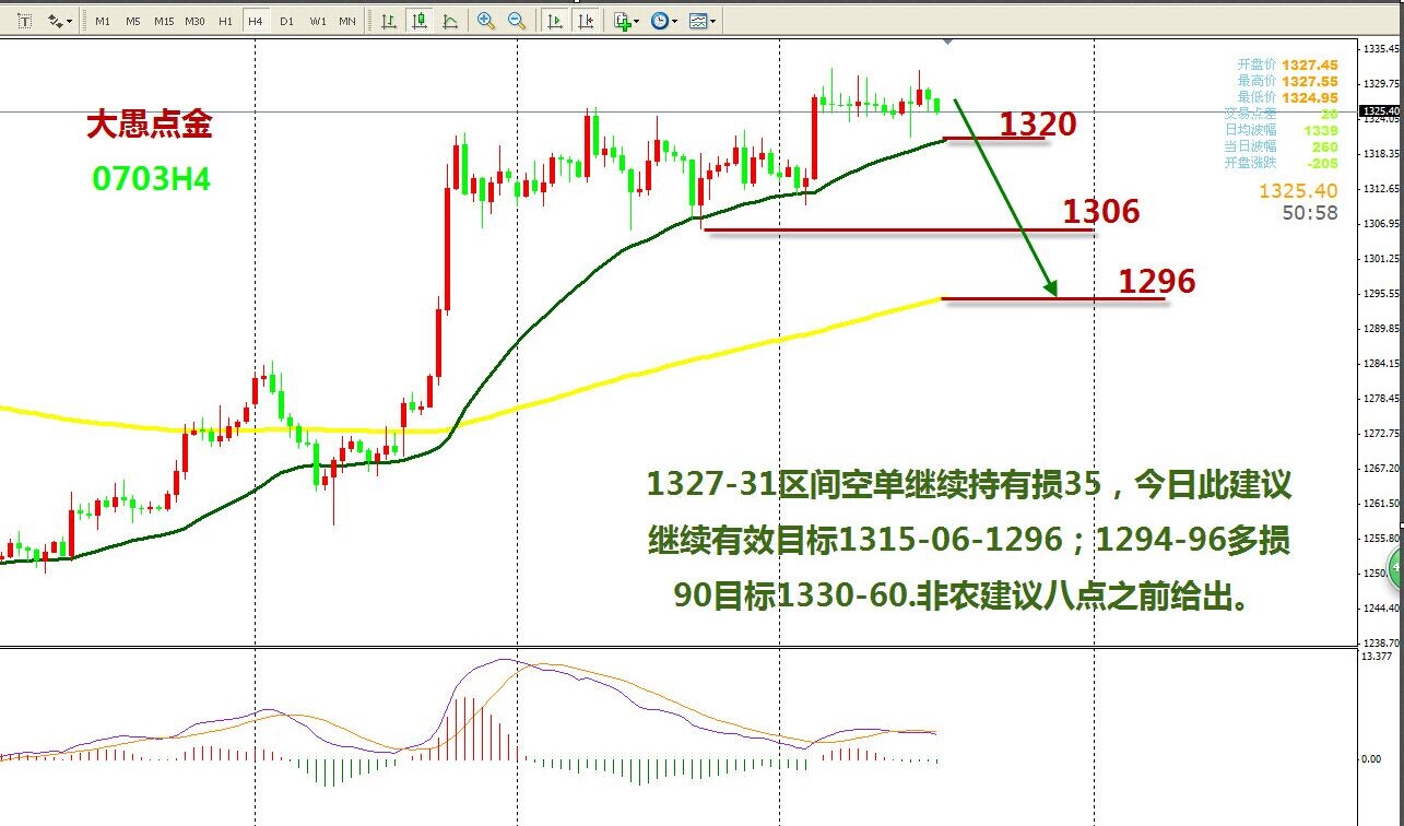 今日建议:1327-31区间空单继续持有损35,今日此建议继续有效目标1315-06-1296;1294-96多损90目标1330-60.非农建议八点之前给出。