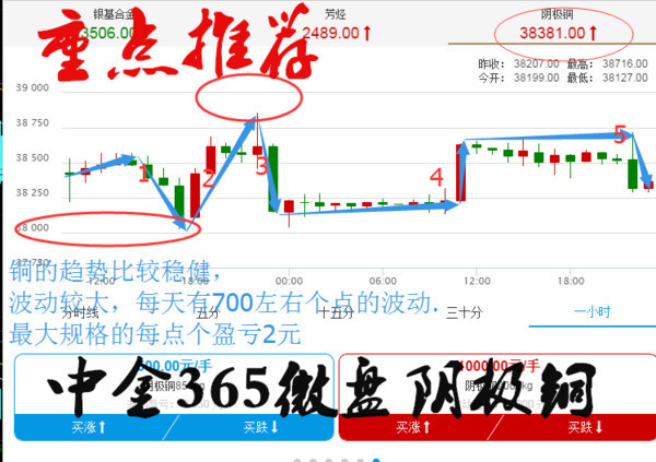 中金365微盘极阴铜。当许多新手老手都在原油白银上来回碰壁时,却遗忘了一个重要的产品极阴铜。,经过本人一直来的观察发现铜的走势很稳健,来回波动很大,趋势很明朗,从中午开始把握了4波大行情,本人的微盘实仓客户今天赚的不亦乐乎,以上是本人截取周五铜的一天的走势,从图上看,今日的阴极铜一直在38000到38750附近来回回震荡,从趋势上看今天有5波大行情可供投资者操作,每次波动为500到750个点不等,以最大规格的1000手为例每个点盈亏2元手续费一手158元,跟上操作每手,轻松盈利1000元左右!做单思路遵守,高空低多的思路,带好止损,新手也能把握利润