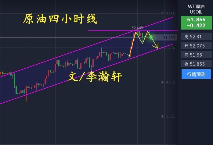 原油昨日开盘再次上冲至52.37美元一线回落,日线出现十字星。从日线图来看。原油价格自45.7美元一线开始单边上涨,到高位52.37美元一线出现高位十字星,如果短周期内再配合两根阴线,短周期原油将会出现黄昏之星是看跌信号,但是当前我们需要做的是等待,等待今明两天的收线后再做定夺,如果再接下来的两个交易日中原油阴阳相互转换,那短周期原油将会出现阶段性调整,但是总而言之,继续上涨的难度很大。4小时图中布林带有向上张口迹象,短周期内继续虚破52.3高点阻力也不是不可能,当前市场中原油看涨气氛还是非常浓厚,但此时继续看涨将会加大风险,所以对于晚间操作还是保持高空,以前期高点为上升阻力介入空单。