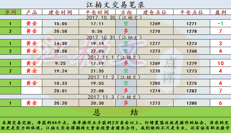 晚间非农冲高回落,柏文预测数据利多,1273附近提前多单进场,止盈1280一线。回落1276加仓做多,1277保本出局。江柏文朋友圈jbw135可以查证查证情况。之所以这么做其实很简单,十点小时线收线行情跳空低开意味着后市行情偏弱,反弹之后很快出局。而此时不少投资者在1278附近肯定有进场多单的,数据利多不代表可以无脑做多,我们需要判断行情的强弱再去做决定跟进,行情走弱、上不破高之后再去做多没有意义,那么此时1278套了也有是个点了。盘中今天是解不出来了,但此时需要提醒投资者的是,投资方向错了不可怕,怕的是不能及时出来,这就是柏文为什么即使损单也只是小损出局的原因。