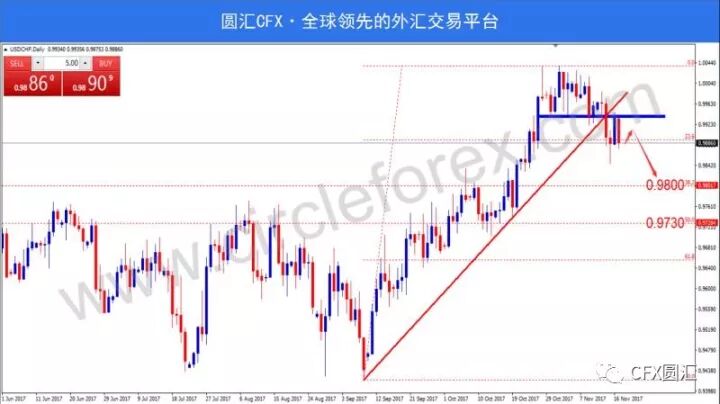 操作建议:D1周期中,价格坚决跌破关键的水平支撑带和上升趋势线且有调整确认该区域阻力的有效性,显示市场弱势格局较为明显,目前市场的流向仍为空头,前期高位持有空头头寸的投资者建议止损下称到水平阻力带上方,在无风险的前提下博取更大的利润空间。没有头寸的投资者建议待价格调整到0.9920附近再考虑做空,止损水平阻力带上方0.9970左右,目标关注斐波那契38.2%和中50%回调位0.9800-0.9730一带。(建议前期持有高位空单的投资者不妨参考该目标。)