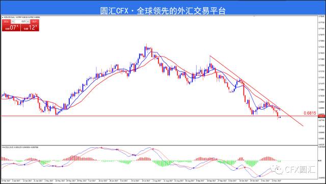 操作建议:上周五纽美跌破前期重要支撑位0.6815后,进一步打开了下行空间。我们看到MACD在0轴下方形成死叉,10日均线(蓝色)下穿20日均线(红色),显示下跌动能依然较强。另外,纽美中长期也受制于自今年9月20日以来的下跌趋势线,在未能成功上破次趋势线之前,投资者都可以考虑主要以做空为主。短期投资者可考虑在0.6830附近再次入场做空,止损设置在0.6870上方。