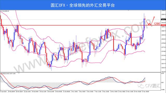 操作建议:黄金在经历一个多月的横盘整理后,上周五借助基本面消息波幅稍有增大。H4周期中,价格已经被一根坚实阳线突破前期高点,短期内价格大概率呈现偏多头走势。当前K线已经同时突破4小时图和日线图布林上轨,未来价格极有可能继续保持上涨。MACD能量柱同时也在放大,同时,快慢线呈现黄金交叉形态。激进的投资者可考虑直接进场做多,止损于布林轨内,价格1290下方70点附近;稳妥的投资者可考虑暂时保持观望,待价格回调至1290附近再考虑进场做多,止损于布林中规下方即可。