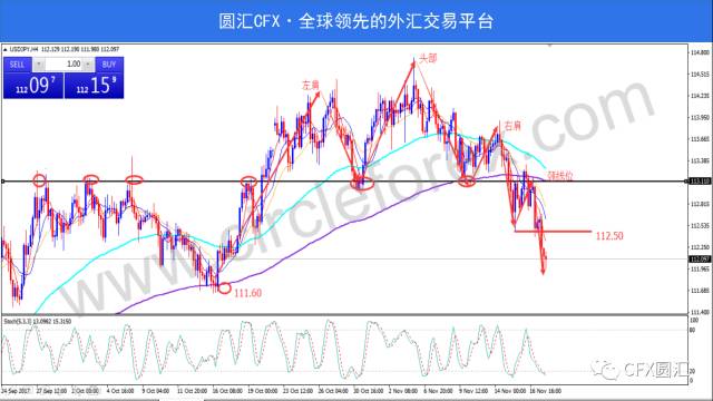操作建议:H4周期显示,汇价上周跌破113.10这一关键支撑位,该区域是自10月16日低点111.60附近形成的头肩顶颈线位,上周四回抽颈线,周五加速回落,单日跌幅达1%,后市建议继续反弹做空为主,关注10月16日低点附近支撑区域,若跌破该位置,汇价恐将试探111关口。另外,上周四建议113.05附近做空美日的投资者可考虑下移止损至保本价附近继续持有。
