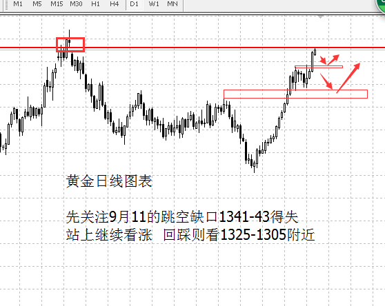目前交易计划:目前黄金价格1341-43附近是9月11号时候的跳空低开位置,不得不重点关注这里的压力得失,所以在今日目前点位时候暂时不会去考虑高位追多了。起码会先关注下1341-43区间内的得失做空机会止损在1346以上即可,破位继续上涨那么就观望等待明天等待回踩1340附近的做多机会就可以了。