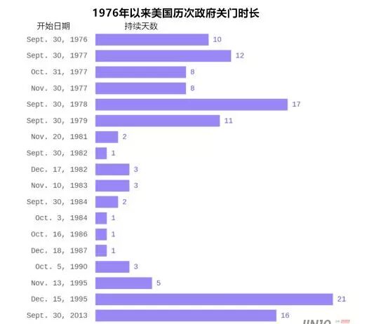 美元指数:美国政府如期关门,给美元伤痕累累的伤口再加一把“盐”,那么美国政府关门会持续多久呢?进入21世界以来,美国政府仅关门一次,在2013年19月,当时奥巴马政府关门16天,联邦政府有月80万雇员进入强迫休假状态,另外有130万人进入无薪酬工作状态,直到16天以后通过拨款法案;美国政府关门给美国的正常运行并不会带来太大影响,就如我们上周讲到的:“美国关门只是一时,最终谈判双方相互妥协,政府恢复工作”;(下图为美国历次关门时长)
