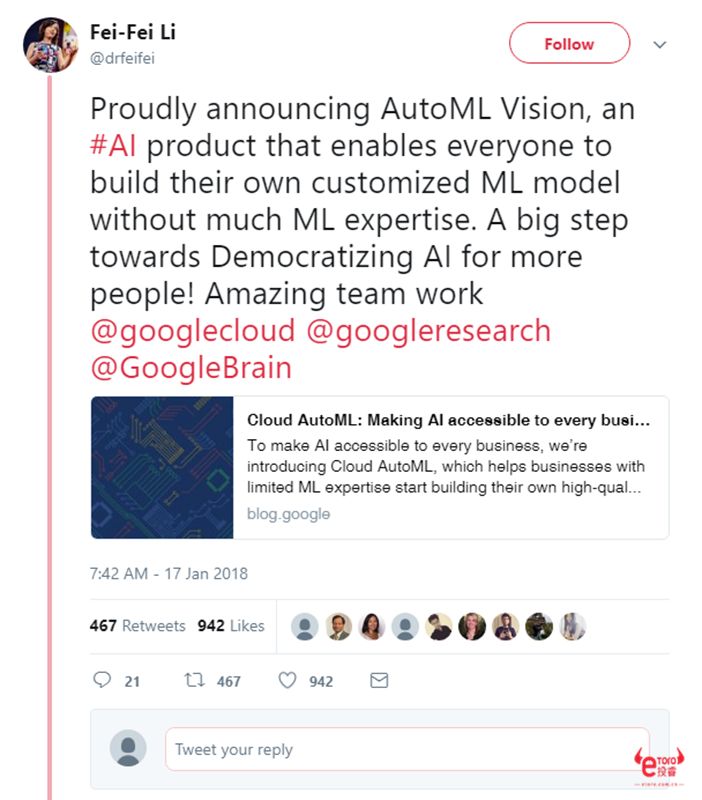 在谷歌(GOOG)撤离中国的第8个年头,“谷歌(GOOG)悄然重返”的传闻甚嚣尘上。而且大家似乎都有一个共识:谷歌(GOOG)欲回中国就必须靠人工智能(AI)。6天前,谷歌(GOOG)的AI首席科学家李飞飞在Twitter上骄傲地宣布:Auto ML正式问世!而这或是谷歌(GOOG)中国战略布局的重要一步,更是其在AI领域获得垄断地位的关键跳板。
