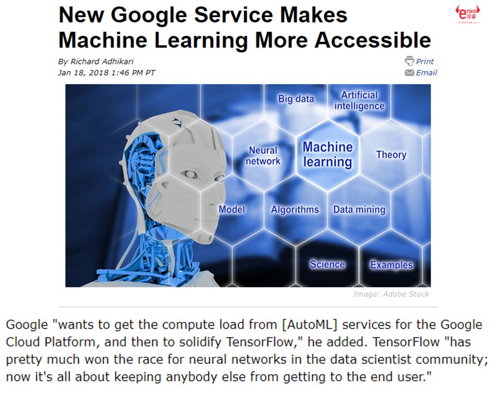 Tensor Flow是用于机器学习(Machine Learning)开源数据库。简而言之,Auto ML要建立自主建立模型就必须汲取Tensor Flow里的各类数据。Constellation Research的分析师认为Auto ML将巩固Tensor Flow在开源数据竞赛中的领先地位。与此同时,他也指出“Tensor Flow中国用户的巨额增长也是为AutoML的市场奠定基础。”