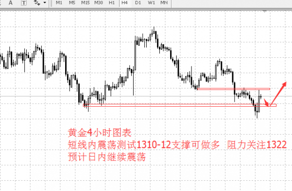 目前来看黄金自1303附近强势反抽,一时半会来看黄金还是处于1310-60的区间内震荡,在黄金强势的测试底部反抽后今日就不能继续看空了,关注下支撑1310-12附近的得失选择做多的机会,阻力依然是关注下1320-22附近站上才能继续说上涨的机会。