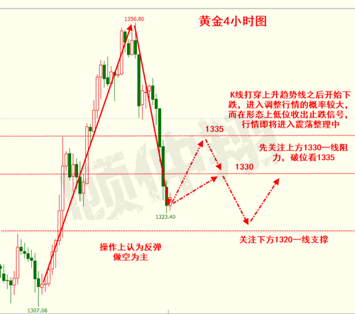 2、1345一线的多单目前来说情况还算乐观,但是一定需要关注1330一线的得失,若黄金形成空头连续行情,那么你的多单就陷入困境了。这个区间的多单其实是最好做出选择的,不管再怎么样发展今天金价是很难到达1345一线,也就是说这个单子赚钱的机会不大,如何减少损失才是你所考虑的,换个思路想一想:多单出掉反手做空,空单能获利的话不也是挽回损失的办法吗?