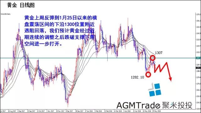 最近一段时间,受到市场的避险情绪逐步缓解的影响,国际金价持续承压。从黄金的中期走势来看,黄金上周反弹到1月25日以来的横盘震荡区间的下沿1307位置附近遇阻回落,随着黄金低位调整时间的延长以及黄金反弹遇阻重新回到5月21日以来的低点1282附近,我们预计黄金经过近期连续的调整之后跌破支撑下落空间进一步打开。中国国内的黄金T+D走势也以低位调整为主,随着国内黄金低点的进一步下移,预计接下来国内的黄金价格也继续承压。