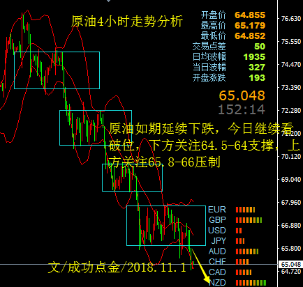 昨日原油符合预期的震荡,反弹测压67一线后如期出现下挫破低,刷新64.80新低位,亚欧盘反弹震荡修正,空间不算大,整体还在台阶高点下方修正。虽然EIA大幅利多,但是还是挡不住欧佩克十月原油产量增加带来的负面情绪,油价应声下跌至近期的低点。K线结构依旧弱势,虽有支撑,但无下探止跌的迹象。由于年线支撑靠近,短线可能先转震荡,但反转还缺少力度和消息面的支持,主要关注美国制裁伊朗的结果。
