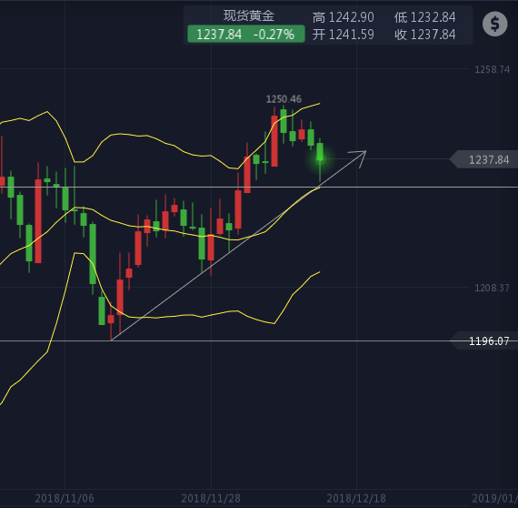 周三:因美元下滑,且对美国明年升息次数的预期减弱,增加了黄金的吸引力。现货黄金小幅收涨。操作上我们整体围绕1240/1241支撑位置做多,美盘上涨于1247附近小利出局;